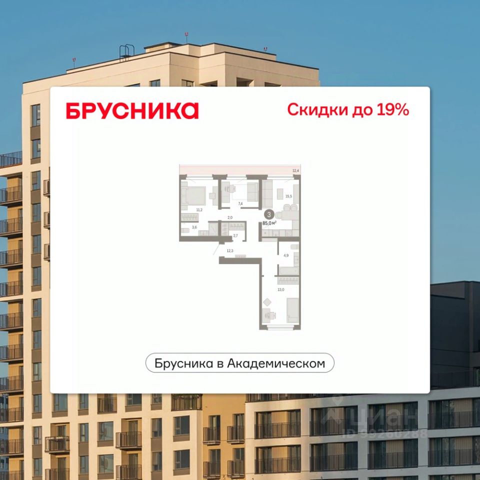 Квартира с кухней-гостиной и двумя спальнями в Бруснике в Академическом. Особенности планировки: вид во двор, второй санузел, гардеробная, двойная выгода, мастер-спальня, предчистовая отделка, рабочий кабинет, разнесённые спальни, терраса на крыше.