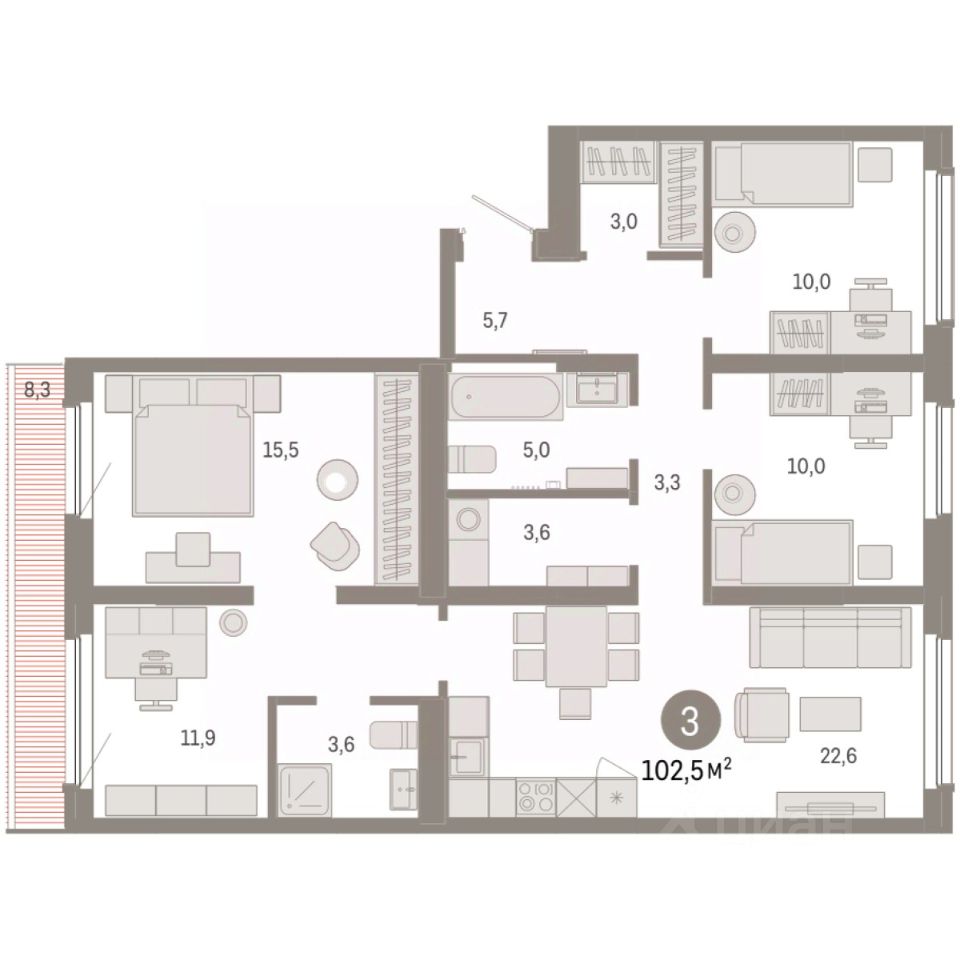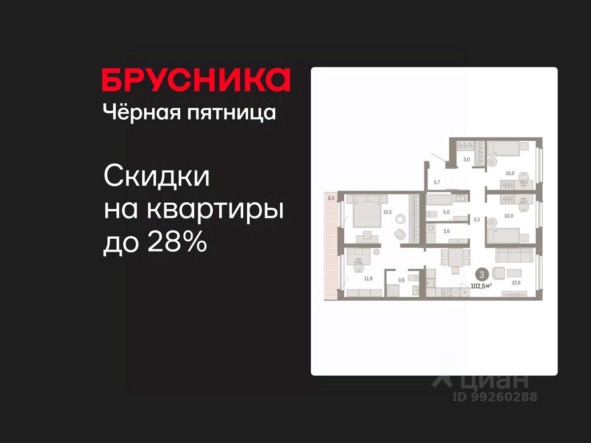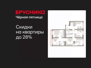 Квартира с кухней-гостиной и тремя спальнями в Бруснике в Академическом. Особенности планировки: второй санузел, гардеробная, вид во двор, разнесённые спальни, предчистовая отделка, мастер-спальня, постирочная, терраса на крыше.