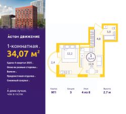 Однокомнатная квартира от застройщика с предчистовой отделкой в ЖК "Астон.Движение" на 4 этаже. Общая площадь: 34.07 кв.м., жилая: 12.2 кв.м., площадь просторной кухни-столовой: 12.6 кв.м. Квартира угловая, очень светлая, естественная вентиляция при открытии окон. В квартире один балкон, один совмещенный санузел. Высота потолков 2.7 м.
