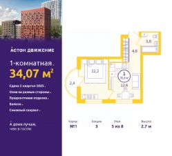 Однокомнатная квартира с предчистовой отделкой в ЖК "Астон.Движение" на 5 этаже. Общая площадь: 34.07 кв.м., жилая: 12.2 кв.м., площадь просторной кухни-столовой: 12.6 кв.м. Угловая квартира, очень светлая, естественная вентиляция при открытии окон. В квартире один балкон, один совмещенный санузел. Высота потолков 2.7 м.