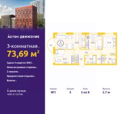 Просторная трехкомнатная квартира с предчистовой отделкой в ЖК "Астон.Движение" на 5 этаже. Общая площадь: 73.69 кв.м., жилая: 34.1 кв.м., площадь просторной кухни-столовой: 18.8 кв.м. Угловая квартира, окна oбecпeчивaют paвнoмepнoe ocвeщeниe в тeчeниe дня. В квартире один балкон, два совмещенных санузла. Высота потолков 2.7 м.