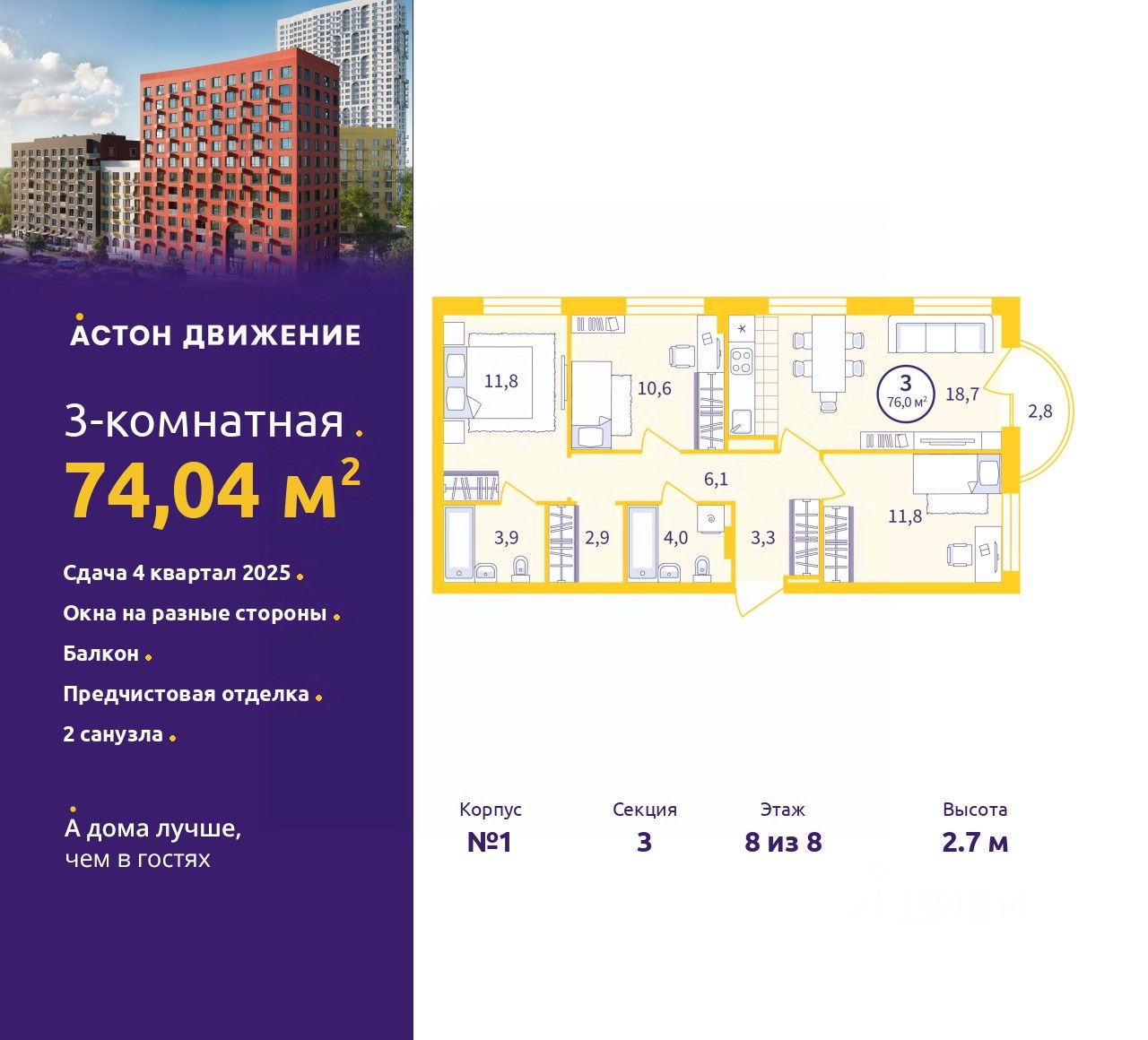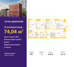 3-комн. квартира с предчистовой отделкой в ЖК "Астон.Движение" на 8 этаже. Общая площадь: 74.04 кв.м., жилая: 34.2 кв.м., площадь просторной кухни-столовой: 18.7 кв.м. Угловая квартира, окна oбecпeчивaют paвнoмepнoe ocвeщeниe в тeчeниe дня. В квартире один балкон, два совмещенных санузла. Высота потолков 2.7 м.