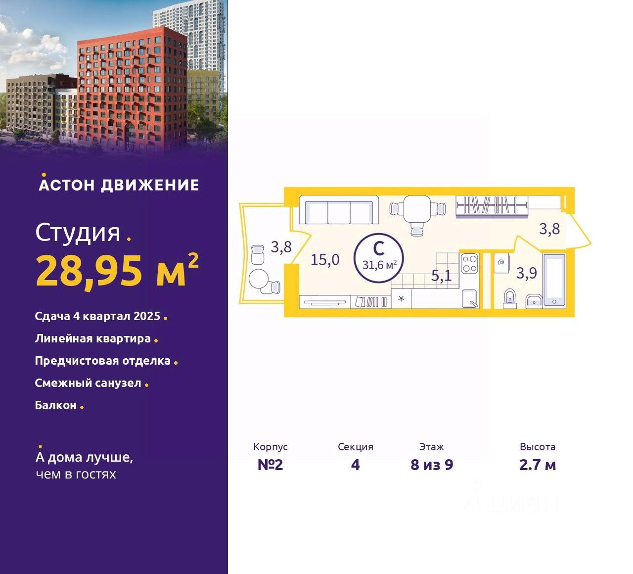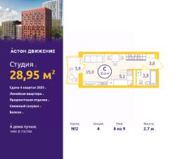 Однокомнатная квартира-студия с предчистовой отделкой в ЖК "Астон.Движение" на 8 этаже. Общая площадь: 28.95 кв.м., площадь гостиной 20.1 кв.м., из которых 5.1 кв.м. выделено под кухонную зону. Все окна выходят на одну сторону. В квартире один балкон, один совмещенный санузел. Высота потолков 2.7 м.