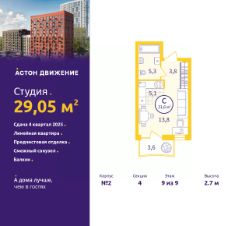 Продается однокомнатная квартира-студия с предчистовой отделкой в ЖК "Астон.Движение" на 9 этаже. Общая площадь: 29.05 кв.м., площадь гостиной 18.9 кв.м., из которых 5.1 кв.м. выделено под кухонную зону. Все окна выходят на одну сторону. В квартире один балкон, один совмещенный санузел. Высота потолков 2.7 м.