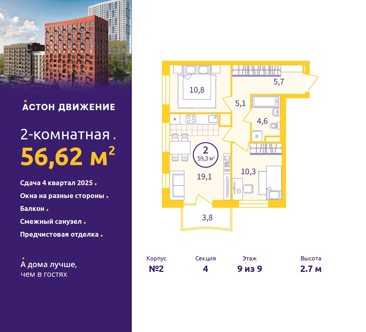 Двухкомнатная квартира с предчистовой отделкой в ЖК "Астон.Движение" на 9 этаже. Общая площадь: 56.62 кв.м., жилая: 21.1 кв.м., площадь просторной кухни-столовой: 19.1 кв.м. Квартира угловая, очень светлая, естественная вентиляция при открытии окон. В квартире один балкон, один совмещенный санузел. Высота потолков 2.7 м.