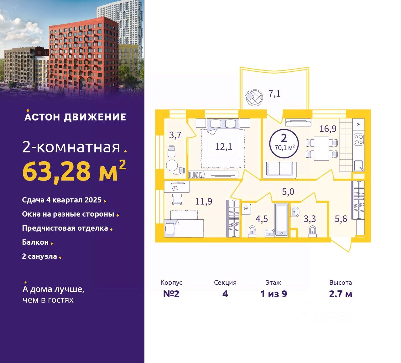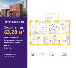 Продается двухкомнатная квартира с предчистовой отделкой в ЖК "Астон.Движение" на 1 этаже. Общая площадь: 63.28 кв.м., жилая: 24 кв.м., площадь просторной кухни-столовой: 16.9 кв.м. Квартира угловая, идеально подойдет любителям тишины и панорамных видов. В квартире один балкон, один совмещенный и один раздельный санузел. Высота потолков 2.7 м.