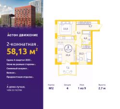 Двухкомнатная квартира с предчистовой отделкой в ЖК "Астон.Движение" на 1 этаже. Общая площадь: 58.13 кв.м., жилая: 21.1 кв.м., площадь просторной кухни-столовой: 19.4 кв.м. Квартира угловая, очень светлая, естественная вентиляция при открытии окон. В квартире один балкон, один совмещенный санузел. Высота потолков 2.7 м.