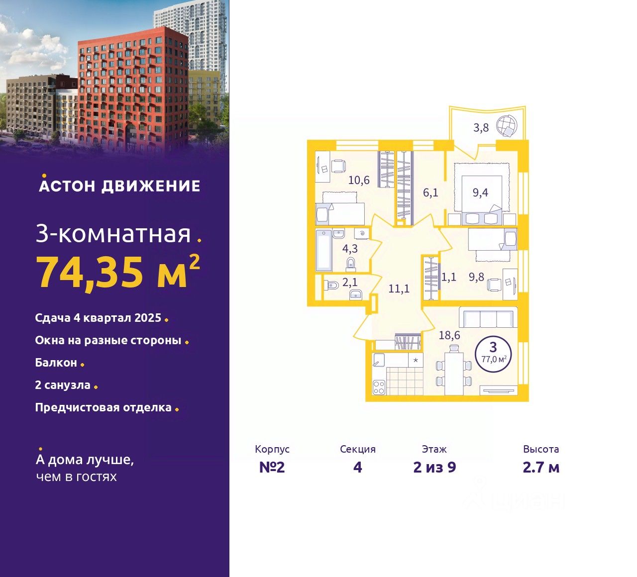 Продается 3-комн. квартира с предчистовой отделкой в ЖК "Астон.Движение" на 2 этаже. Общая площадь: 74.35 кв.м., жилая: 29.8 кв.м., площадь просторной кухни-столовой: 18.6 кв.м. Квартира угловая, идеально подойдет любителям тишины и панорамных видов. В квартире один балкон, один совмещенный и один раздельный санузел. Высота потолков 2.7 м.