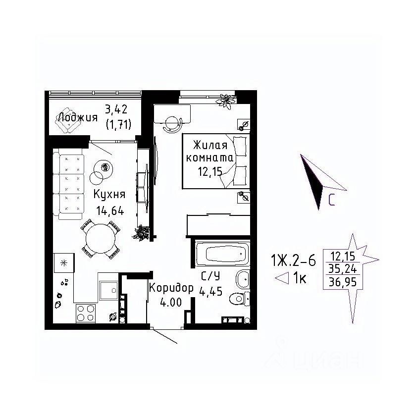 Общая площадь36,95 м²