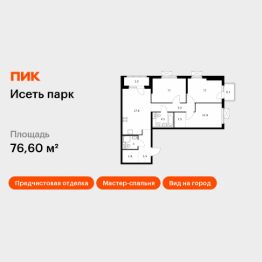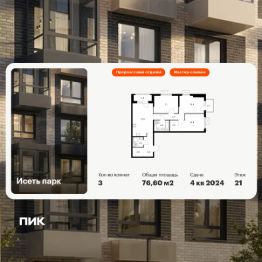 Продаётся 3-комн. квартира площадью 76,6 кв.м на 21 этаже 24 этажного дома (Корпус 4, Секция 1) проекта ПИК Исеть парк. Светлый просторный подъезд на уровне земли, функциональная планировка, большие окна, предчистовая отделка.
