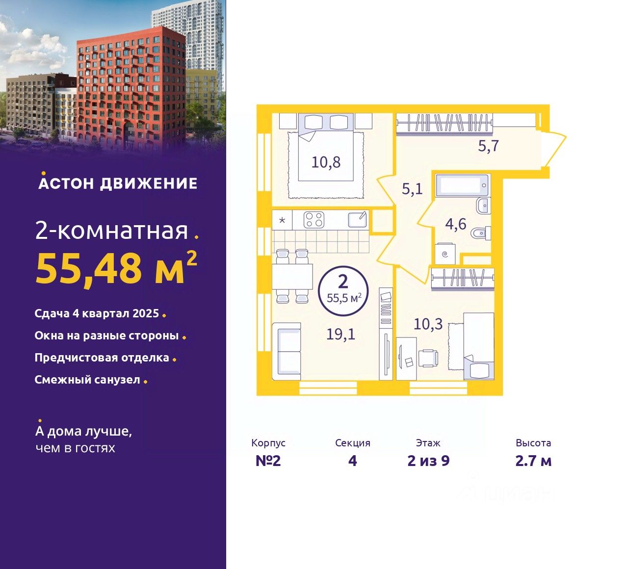 Двухкомнатная квартира от застройщика с предчистовой отделкой в ЖК "Астон.Движение" на 2 этаже. Общая площадь: 55.48 кв.м., жилая: 21.1 кв.м., площадь просторной кухни-столовой: 19.1 кв.м. Угловая квартира, окна oбecпeчивaют paвнoмepнoe ocвeщeниe в тeчeниe дня. В квартире один совмещенный санузел. Высота потолков 2.7 м.