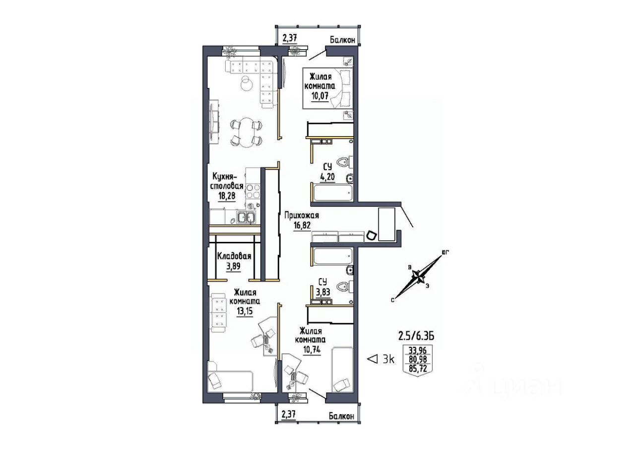 Продаётся 3-комнатная квартира в сданном доме (Тюльпановая, 11 (Дом 11)), срок сдачи: III-кв. 2024, общей площадью 85.72 кв.м., на 5 этаже. Вторая очередь строительства