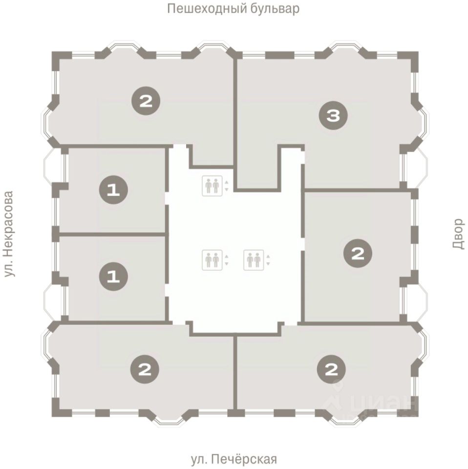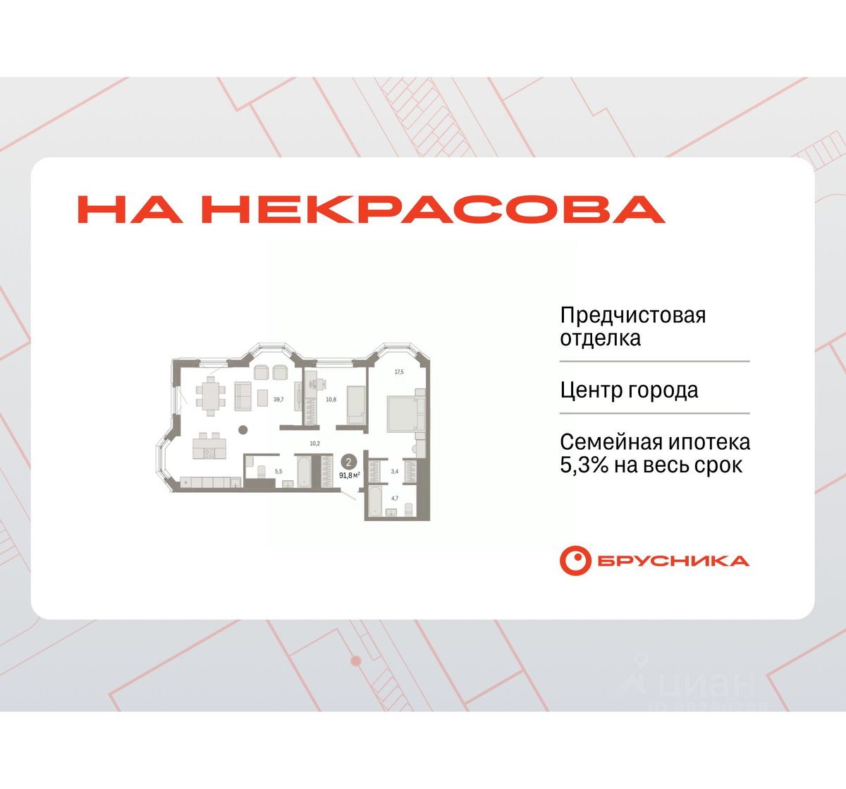 Квартира с кухней-гостиной и двумя спальнями в квартале "На Некрасова". Особенности планировки: второй санузел, предчистовая отделка, мастер-спальня.