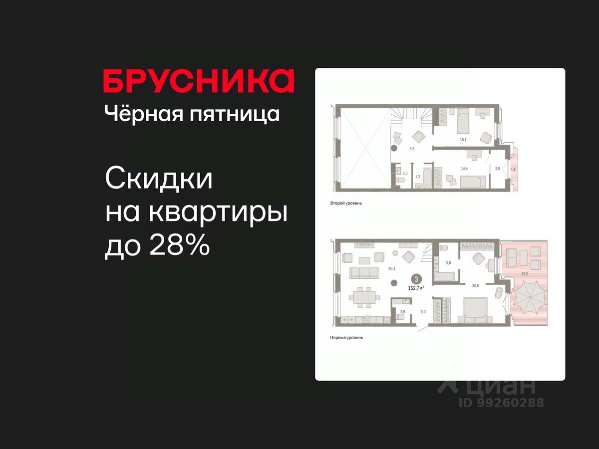 Двухуровневая квартира с кухней-гостиной и тремя спальнями в квартале "На Некрасова". Особенности планировки: второй санузел, окно в коридоре, окна в пол, двухуровневая, вид во двор, тёплая лоджия, второй свет, разнесённые спальни, предчистовая отделка, мастер-спальня, терраса, балкон, терраса на крыше.