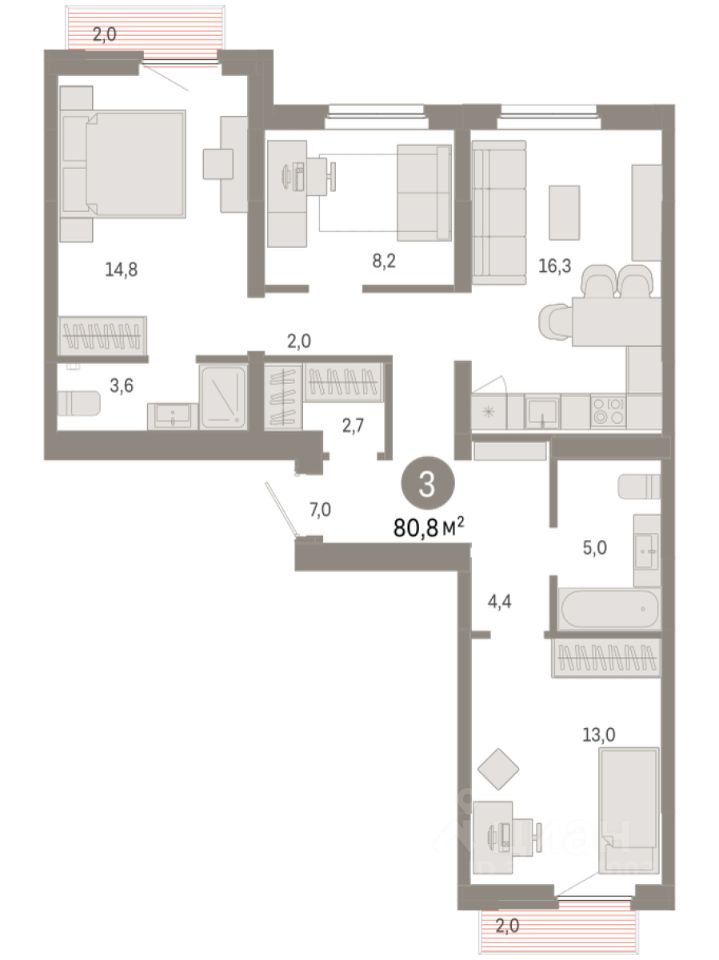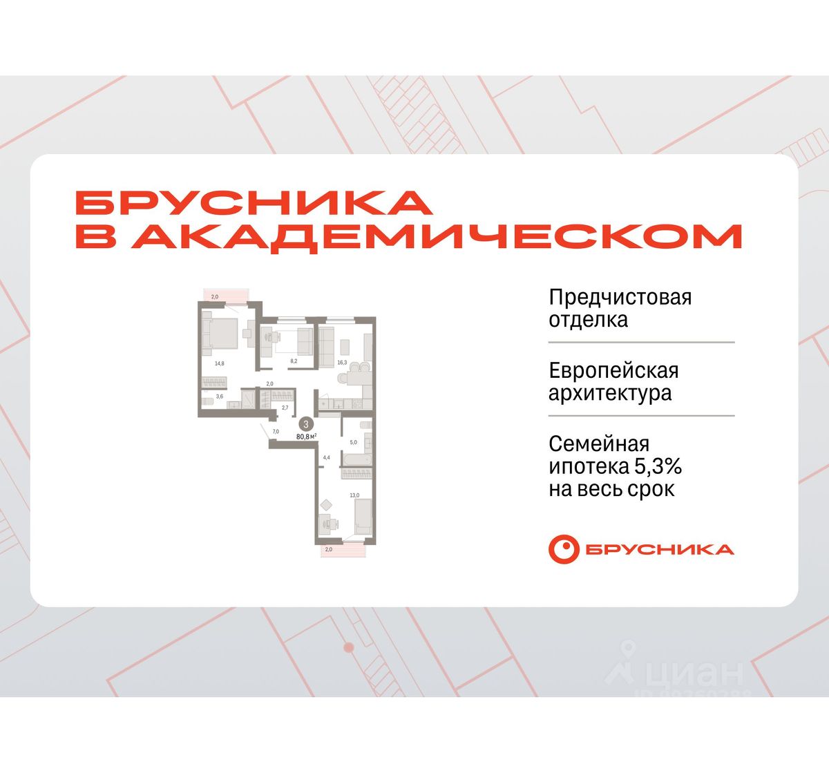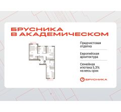 Квартира с кухней-гостиной и тремя спальнями в Бруснике в Академическом. Особенности планировки: второй санузел, гардеробная, рабочий кабинет, вид во двор, разнесённые спальни, предчистовая отделка, мастер-спальня, балкон.