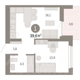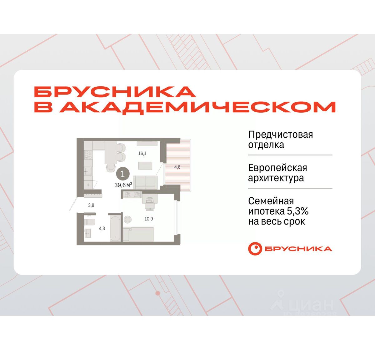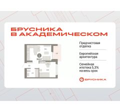 Квартира с кухней-гостиной и одной спальней в Бруснике в Академическом. Особенности планировки: предчистовая отделка, балкон.