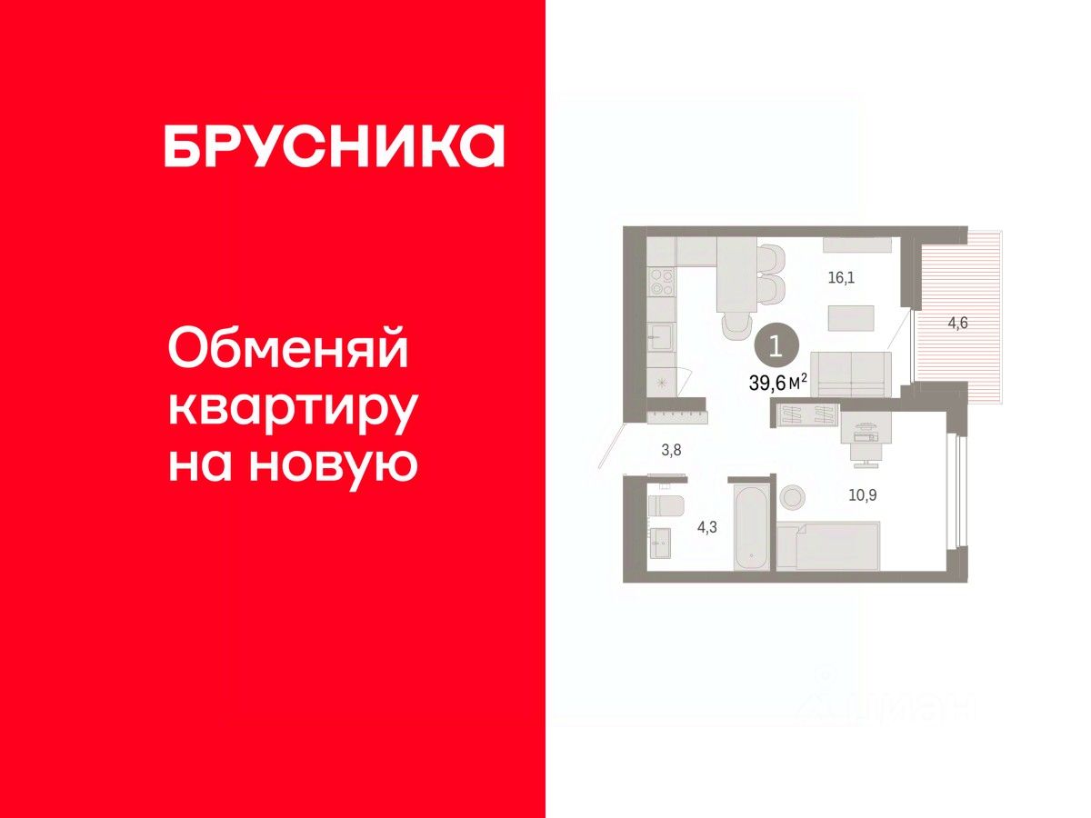 Квартира с кухней-гостиной и одной спальней в Бруснике в Академическом. Особенности планировки: балкон, предчистовая отделка.
