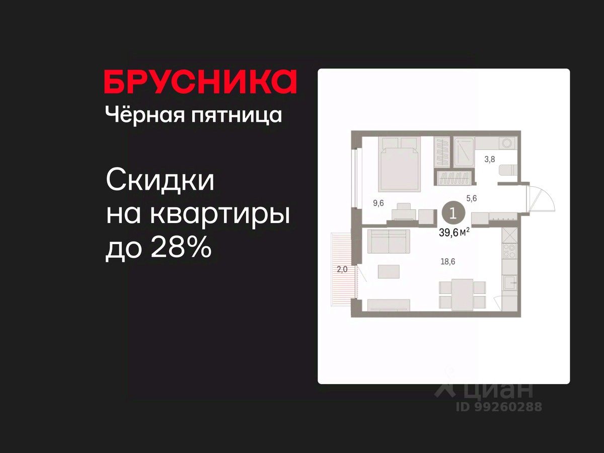 Квартира с кухней-гостиной и одной спальней в Бруснике в Академическом. Особенности планировки: предчистовая отделка, балкон.