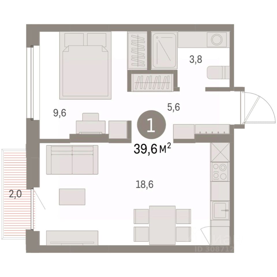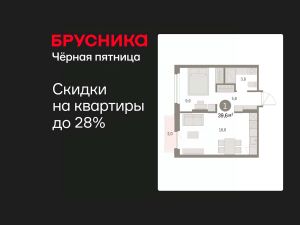 Квартира с кухней-гостиной и одной спальней в Бруснике в Академическом. Особенности планировки: предчистовая отделка, балкон.