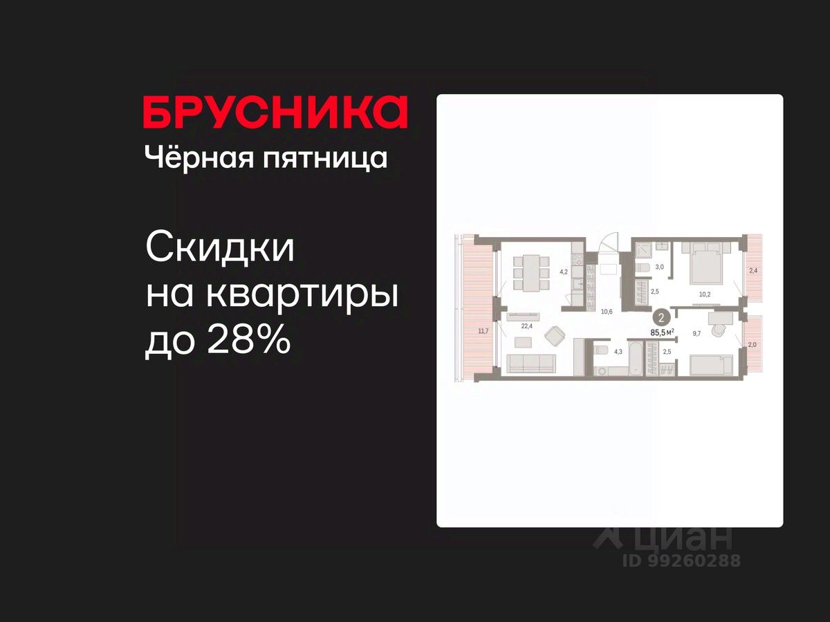 Квартира с кухней-гостиной и двумя спальнями в Бруснике в Академическом. Особенности планировки: окна на две стороны, гардеробная, вид во двор, предчистовая отделка, мастер-спальня, балкон, терраса на крыше.