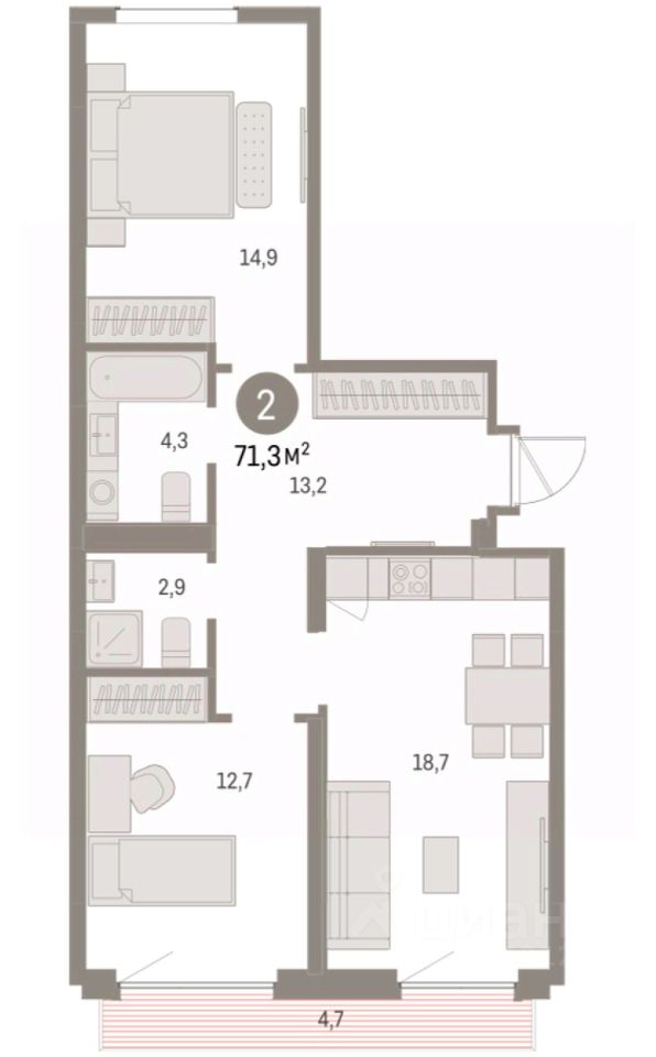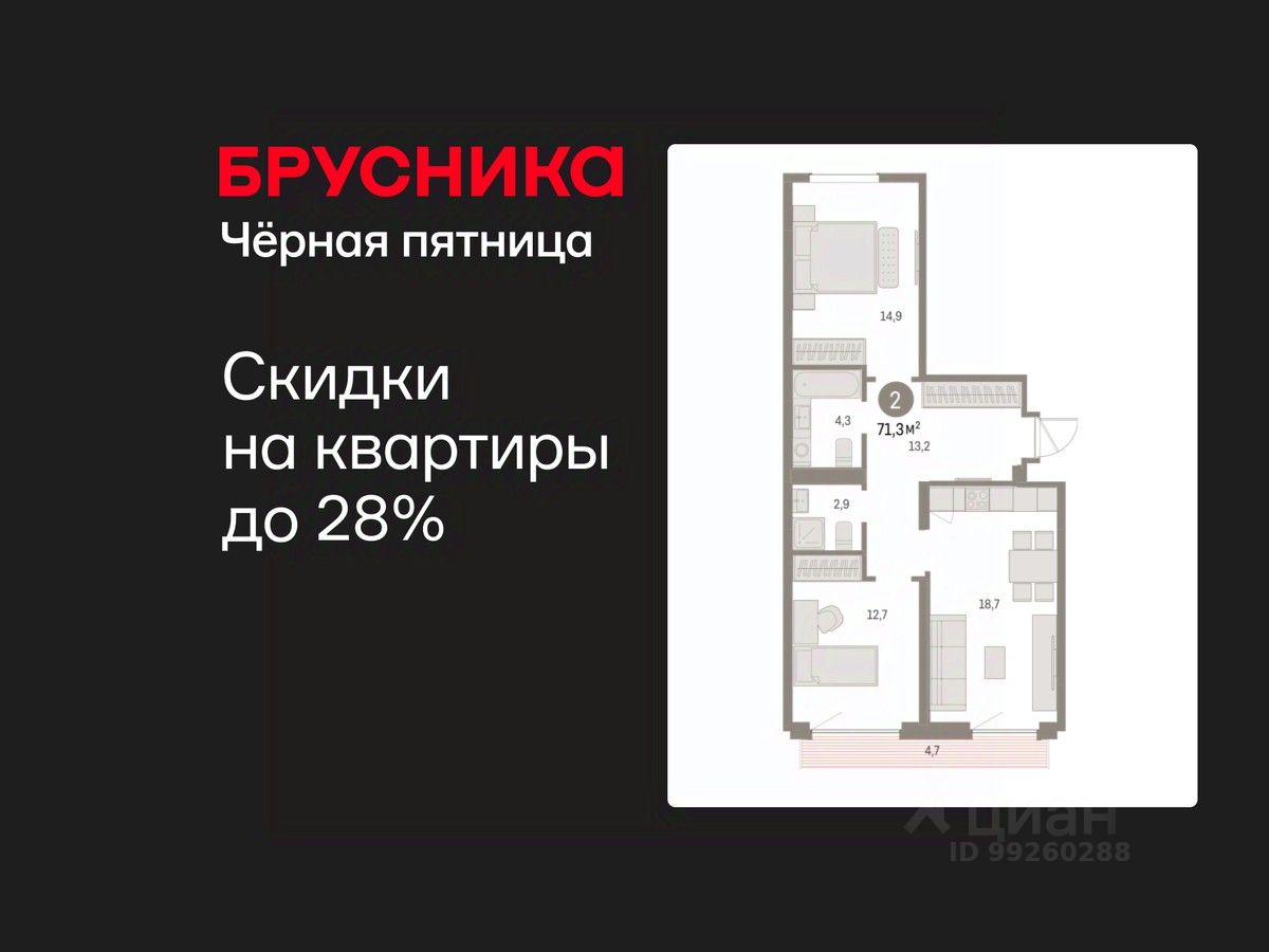 Квартира с кухней-гостиной и двумя спальнями в Бруснике в Академическом. Особенности планировки: окна на две стороны, второй санузел, вид во двор, разнесённые спальни, предчистовая отделка, балкон.