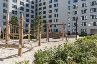 Камерные дворы квартала закрыты от машин. По нашим стандартам 70% их территории покрывает зелень. Деревья, кустарники и травы подобраны таким образом, чтобы в каждый сезон двор оставался красивым и имел свой цвет. Каждый двор разделён на зоны. В одной расположены детские площадки, в другой — места для спорта и тихого отдыха взрослых.