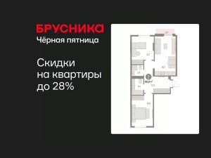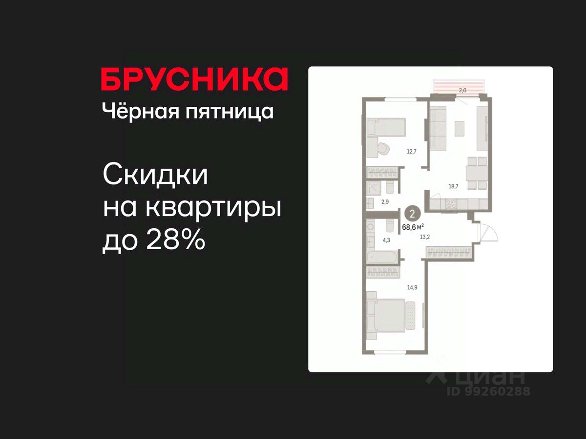 Квартира с кухней-гостиной и двумя спальнями в Бруснике в Академическом. Особенности планировки: окна на две стороны, второй санузел, вид во двор, разнесённые спальни, предчистовая отделка, балкон.