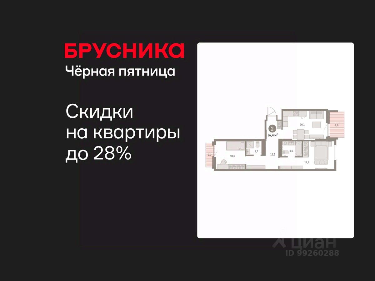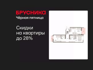 Квартира с кухней-гостиной и двумя спальнями в Бруснике в Академическом. Особенности планировки: окна на две стороны, вид во двор, разнесённые спальни, предчистовая отделка, мастер-спальня, балкон.