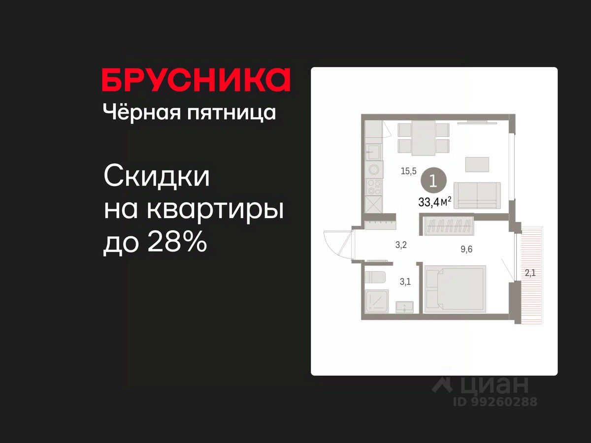Квартира с кухней-гостиной и одной спальней в Бруснике в Академическом. Особенности планировки: предчистовая отделка, балкон.