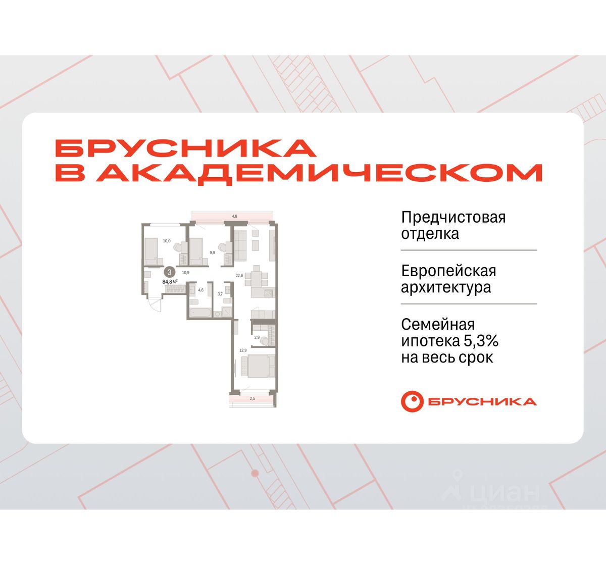 Квартира с кухней-гостиной и тремя спальнями в Бруснике в Академическом. Особенности планировки: окна на две стороны, второй санузел, гардеробная, вид во двор, разнесённые спальни, предчистовая отделка, балкон, терраса на крыше.