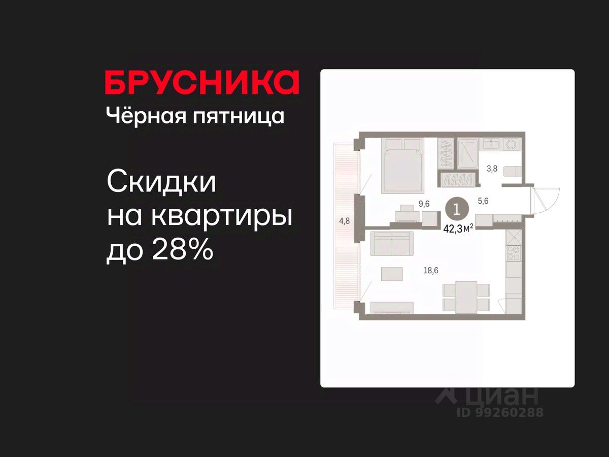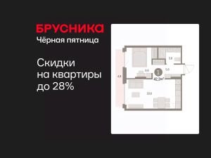 Квартира с кухней-гостиной и одной спальней в Бруснике в Академическом. Особенности планировки: предчистовая отделка, балкон.