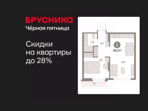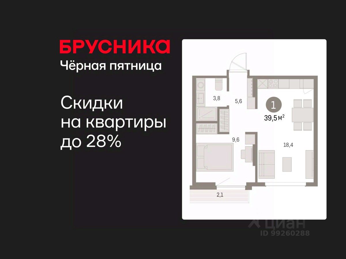 Квартира с кухней-гостиной и одной спальней в Бруснике в Академическом. Особенности планировки: предчистовая отделка, балкон.