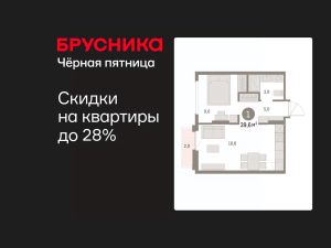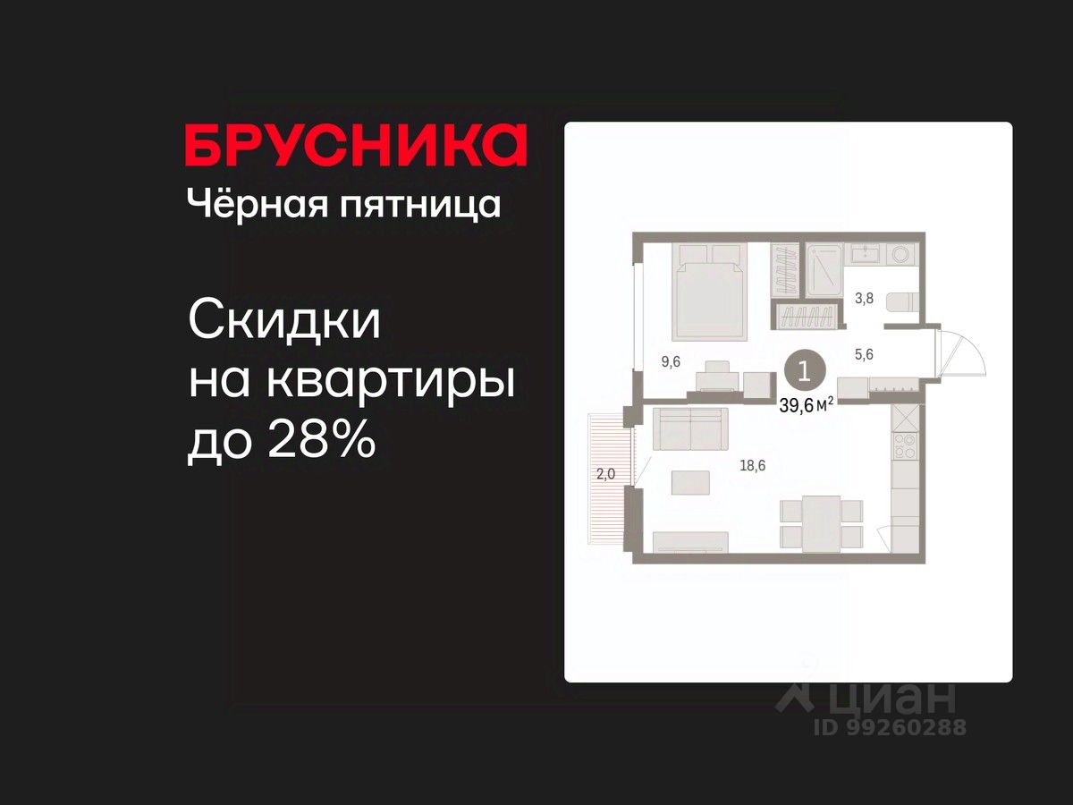 Квартира с кухней-гостиной и одной спальней в Бруснике в Академическом. Особенности планировки: предчистовая отделка, балкон.