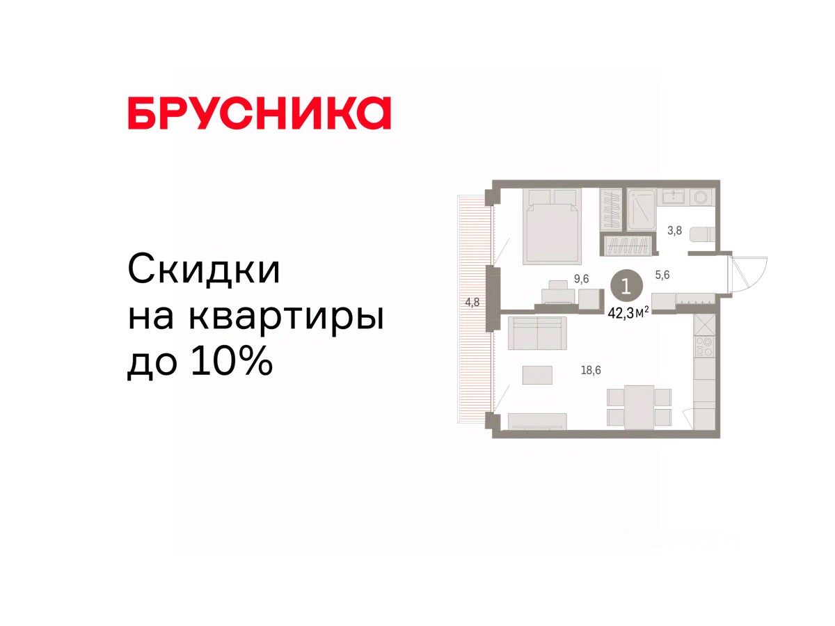 Квартира с кухней-гостиной и одной спальней в Бруснике в Академическом. Особенности планировки: балкон, предчистовая отделка.