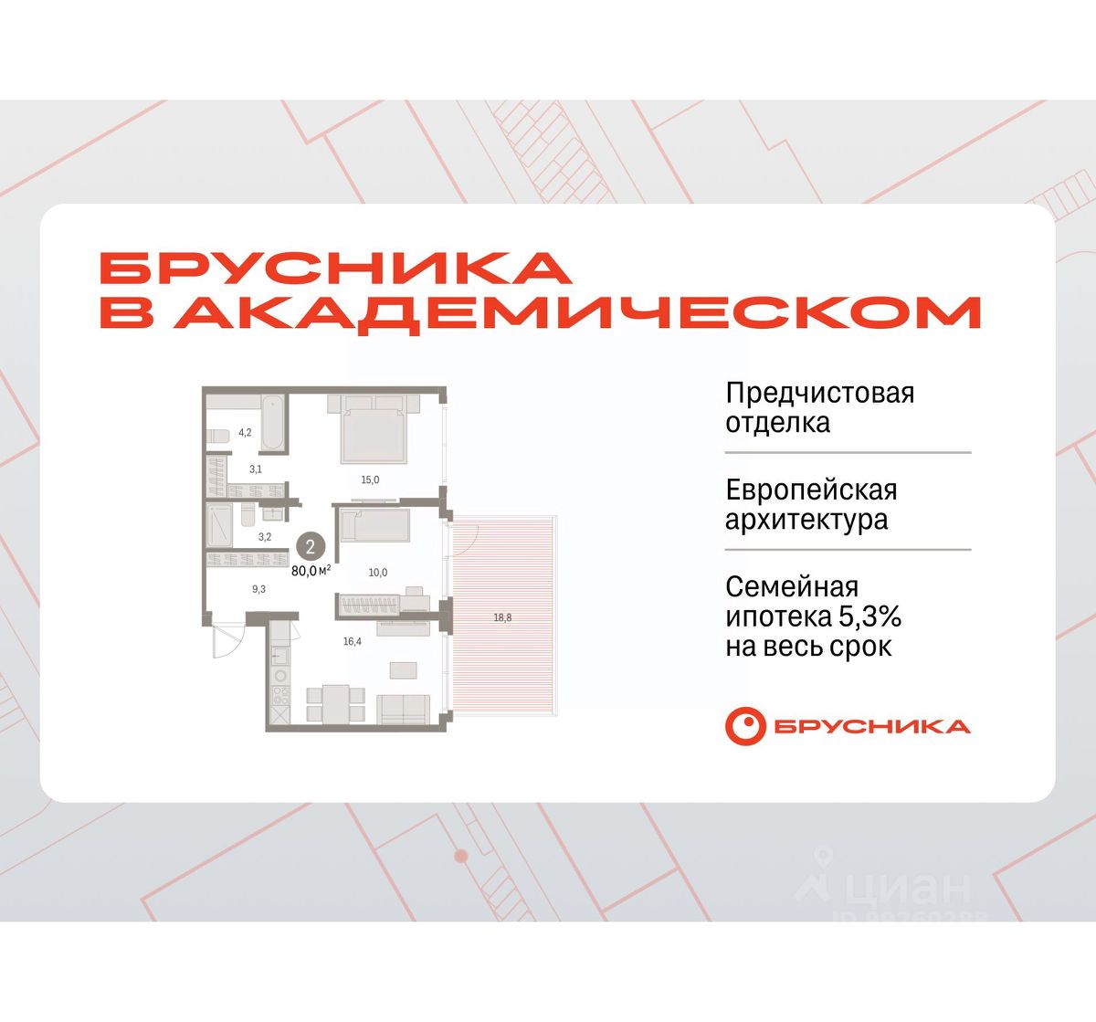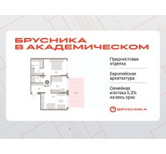 Квартира с кухней-гостиной и двумя спальнями в Бруснике в Академическом. Особенности планировки: гардеробная, окна в пол, вид во двор, предчистовая отделка, мастер-спальня, терраса.