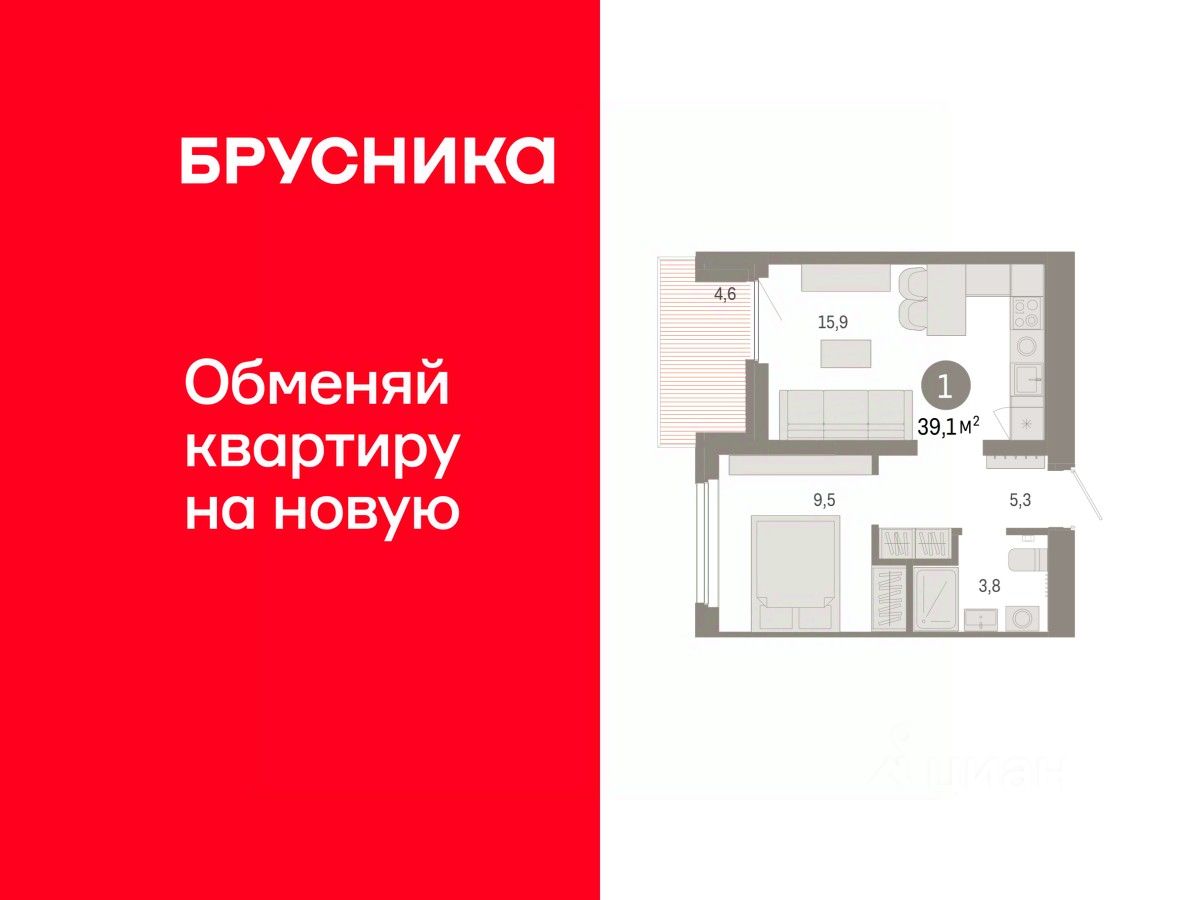 Квартира с кухней-гостиной и одной спальней в Бруснике в Академическом. Особенности планировки: балкон, предчистовая отделка.