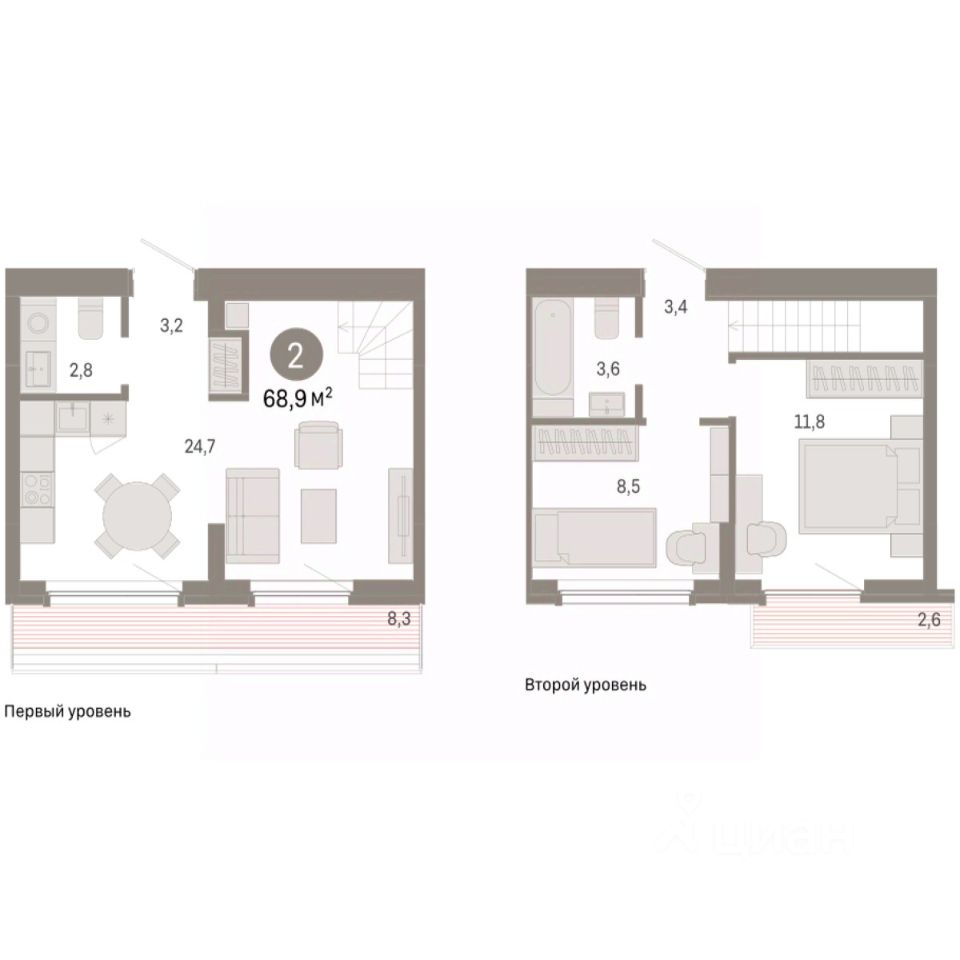 Квартира с кухней-гостиной и двумя спальнями в Бруснике в Академическом. Особенности планировки: второй санузел, разнесённые спальни, предчистовая отделка, балкон, терраса на крыше.