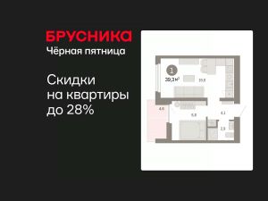 Квартира с кухней-гостиной и одной спальней в Бруснике в Академическом. Особенности планировки: предчистовая отделка, балкон.