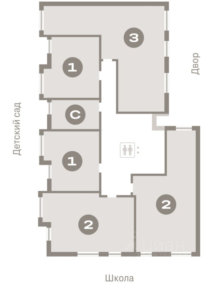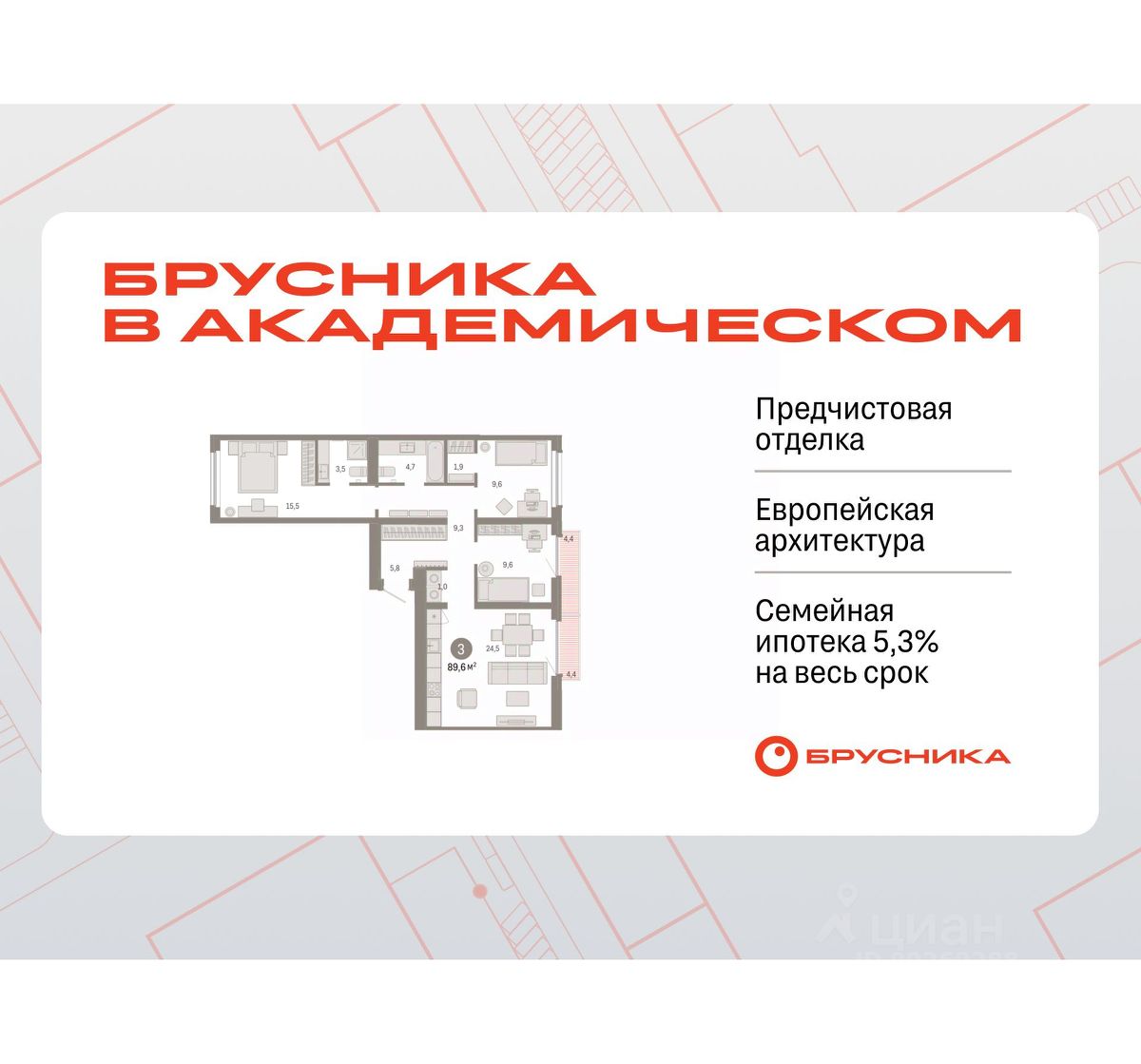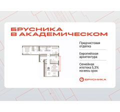 Квартира с кухней-гостиной и тремя спальнями в Бруснике в Академическом. Особенности планировки: второй санузел, гардеробная, вид во двор, разнесённые спальни, предчистовая отделка, мастер-спальня, постирочная, балкон.