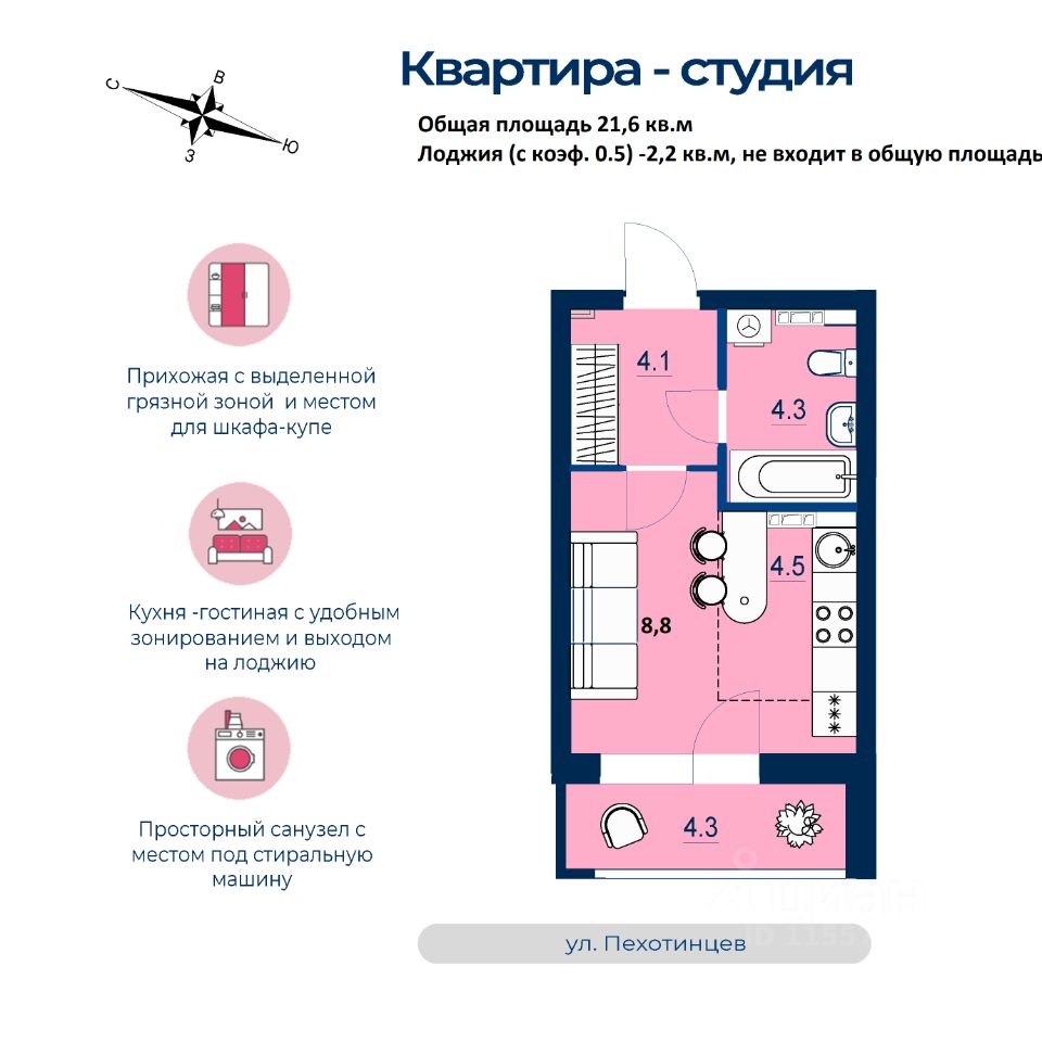 Продаётся студия в сданном доме (Пехотинцев, 2А/1), срок сдачи: I-кв. 2026, общей площадью 21.6 кв.м., на 2 этаже. Новый жилой комплекс "Estelle" от застройщика "СЗ Инвестстрой" расположен по адресу: г. Екатеринбург, улица Пехотинцев.