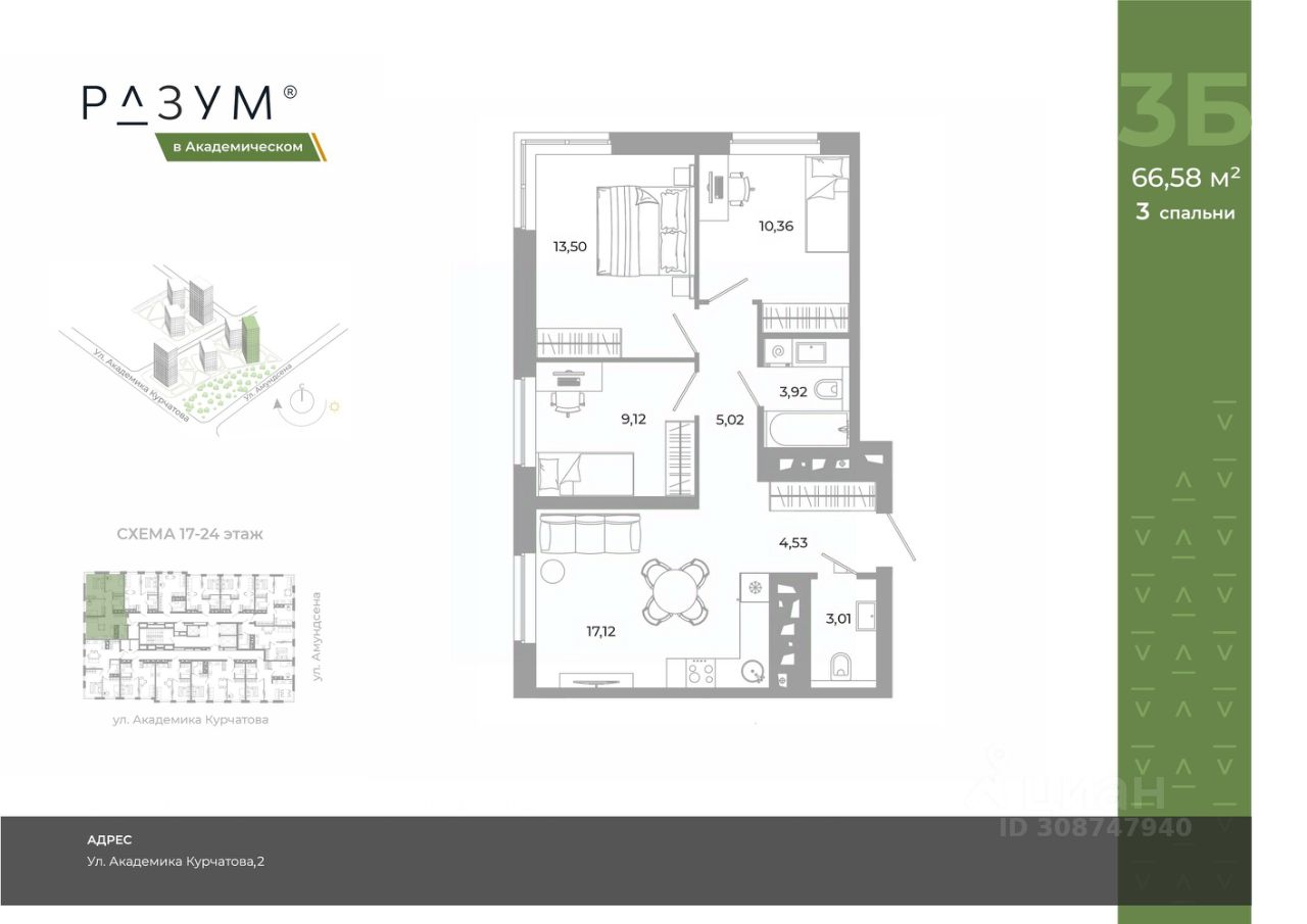 "РАЗУМ в Академическом" — это жилой комплекс из 7 домов переменной этажности от федерального девелопера "РАЗУМ" с 12-летним опытом создания жилых проектов. Дома от 12 до 24 этажей расположены в границах ул. Амундсена. В пешей доступности: - 6 школ; - 10 детских садов; - магазины; - поликлиники; - фитнес-залы. Рядом удобный выезд на ЕКАД. Главная особенность проекта — угловое остекление, которое составляет 22% всей площади. Окна в квартирах установлены в 60 см от пола. Увеличенная площадь остекления помогает снизить затраты на энергоресурсы и создаёт уют в квартире. Сердце жилого комплекса — приватный двор-парк с игровыми комплексами, тренажерами, площадками. "городские грядки" — новое решение благоустройства, где выращиваются ароматные травы или цветы. За пределами комплекса есть прогулочная зона с эко-тропой с вдохновляющими надписями. Прогулки по эко-тропе — это променады наедине с природой. "РАЗУМ в Академическом" — это: - территория без машин; - безбарьерная среда; - единый экостиль в оформлении дворового пространства; - 11 тематических зоны в двор-парке; - многоуровневое освещение и подсветка фасадов; - видеонаблюдение; - гостевой паркинг; - эстетичные подъездные холлы со сквозными подъездами и комфортной зоной ожидания; - Разделенные колясочные и велосипедные зоны; - Велосипедные на 1 этаже; - Кладовые помещения на каждом этаже и на -1 этаже. В проекте 25 планировочных решений: от уютных студий от 21,51 м² до квартир с тремя спальнями и кухней-гостиной до 66,58 м² с функциональным разделением на гостевую и приватные зоны.