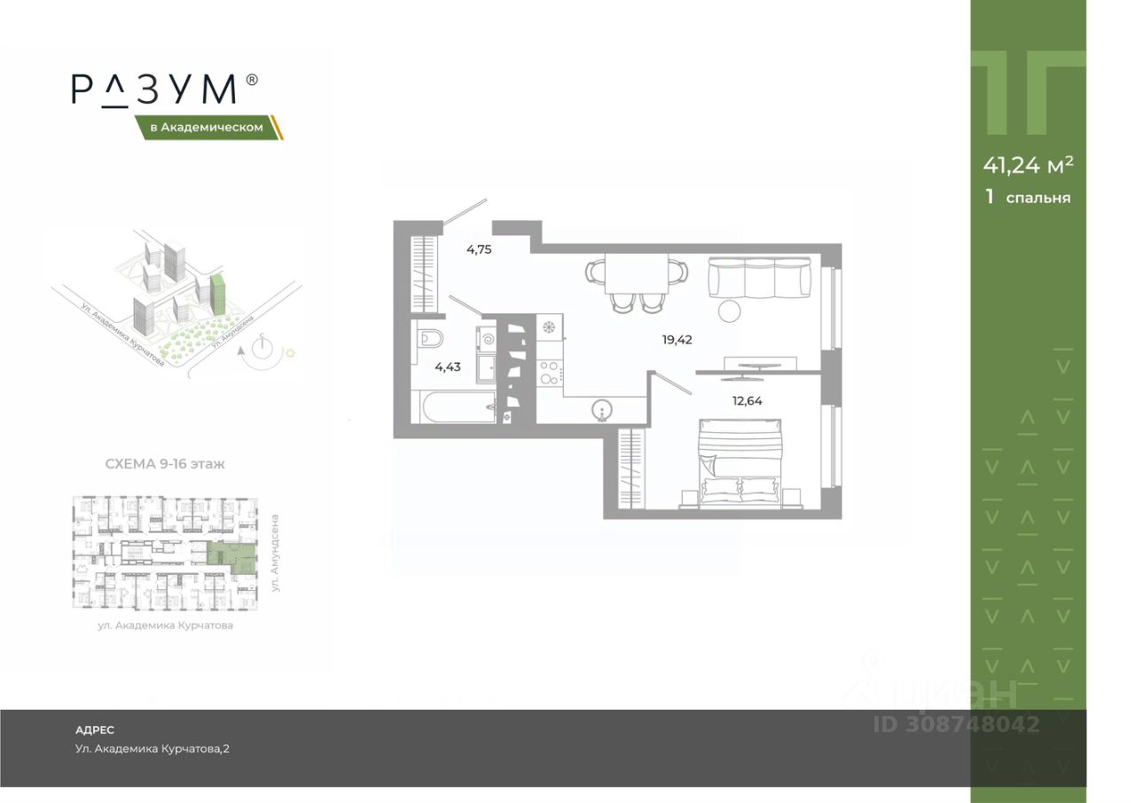 "РАЗУМ в Академическом" — это жилой комплекс из 7 домов переменной этажности от федерального девелопера "РАЗУМ" с 12-летним опытом создания жилых проектов. Дома от 12 до 24 этажей расположены в границах ул. Амундсена. В пешей доступности: - 6 школ; - 10 детских садов; - магазины; - поликлиники; - фитнес-залы. Рядом удобный выезд на ЕКАД. Главная особенность проекта — угловое остекление, которое составляет 22% всей площади. Окна в квартирах установлены в 60 см от пола. Увеличенная площадь остекления помогает снизить затраты на энергоресурсы и создаёт уют в квартире. Сердце жилого комплекса — приватный двор-парк с игровыми комплексами, тренажерами, площадками. "городские грядки" — новое решение благоустройства, где выращиваются ароматные травы или цветы. За пределами комплекса есть прогулочная зона с эко-тропой с вдохновляющими надписями. Прогулки по эко-тропе — это променады наедине с природой. "РАЗУМ в Академическом" — это: - территория без машин; - безбарьерная среда; - единый экостиль в оформлении дворового пространства; - 11 тематических зоны в двор-парке; - многоуровневое освещение и подсветка фасадов; - видеонаблюдение; - гостевой паркинг; - эстетичные подъездные холлы со сквозными подъездами и комфортной зоной ожидания; - Разделенные колясочные и велосипедные зоны; - Велосипедные на 1 этаже; - Кладовые помещения на каждом этаже и на -1 этаже. В проекте 25 планировочных решений: от уютных студий от 21,51 м² до квартир с тремя спальнями и кухней-гостиной до 66,58 м² с функциональным разделением на гостевую и приватные зоны.