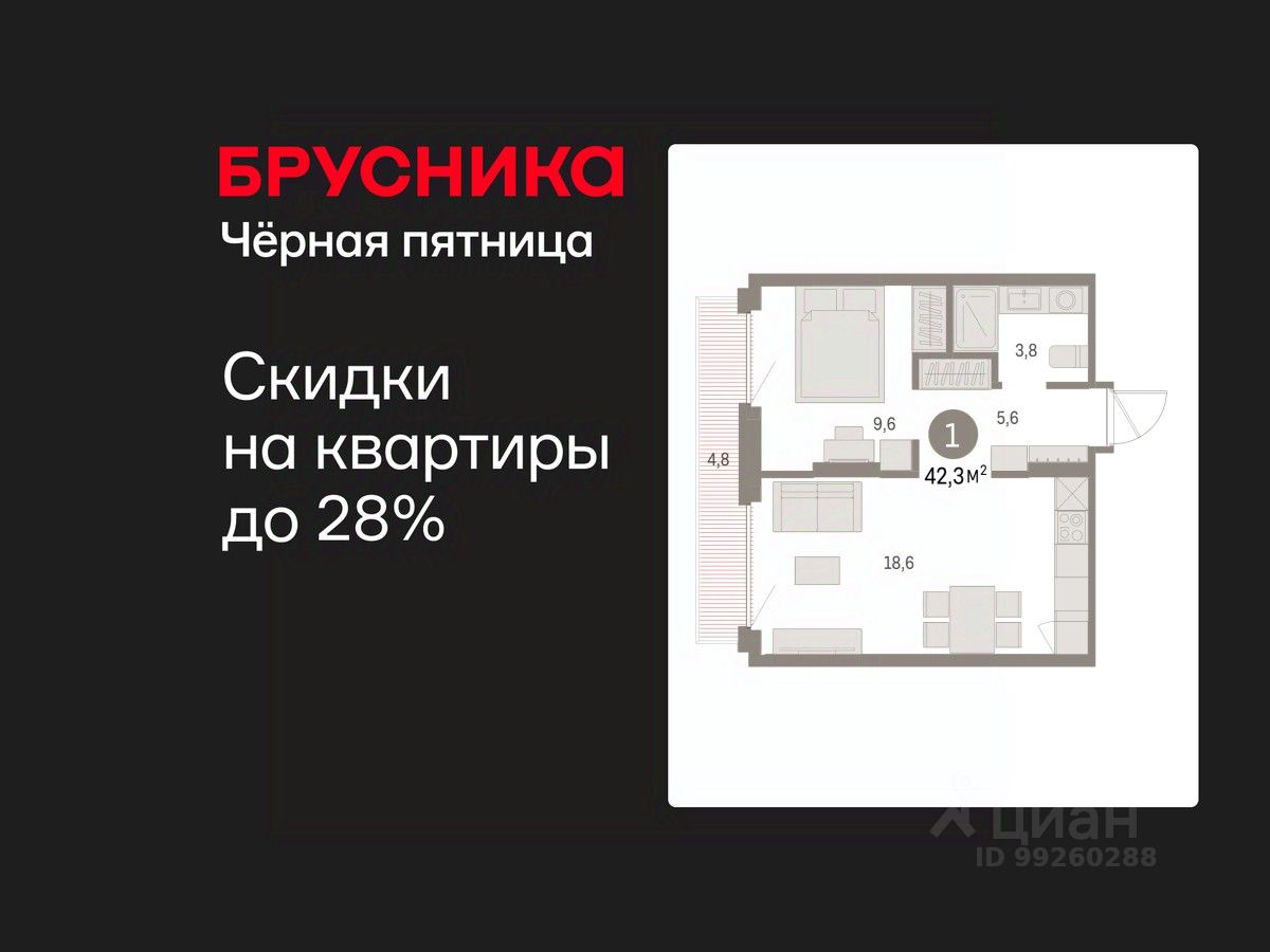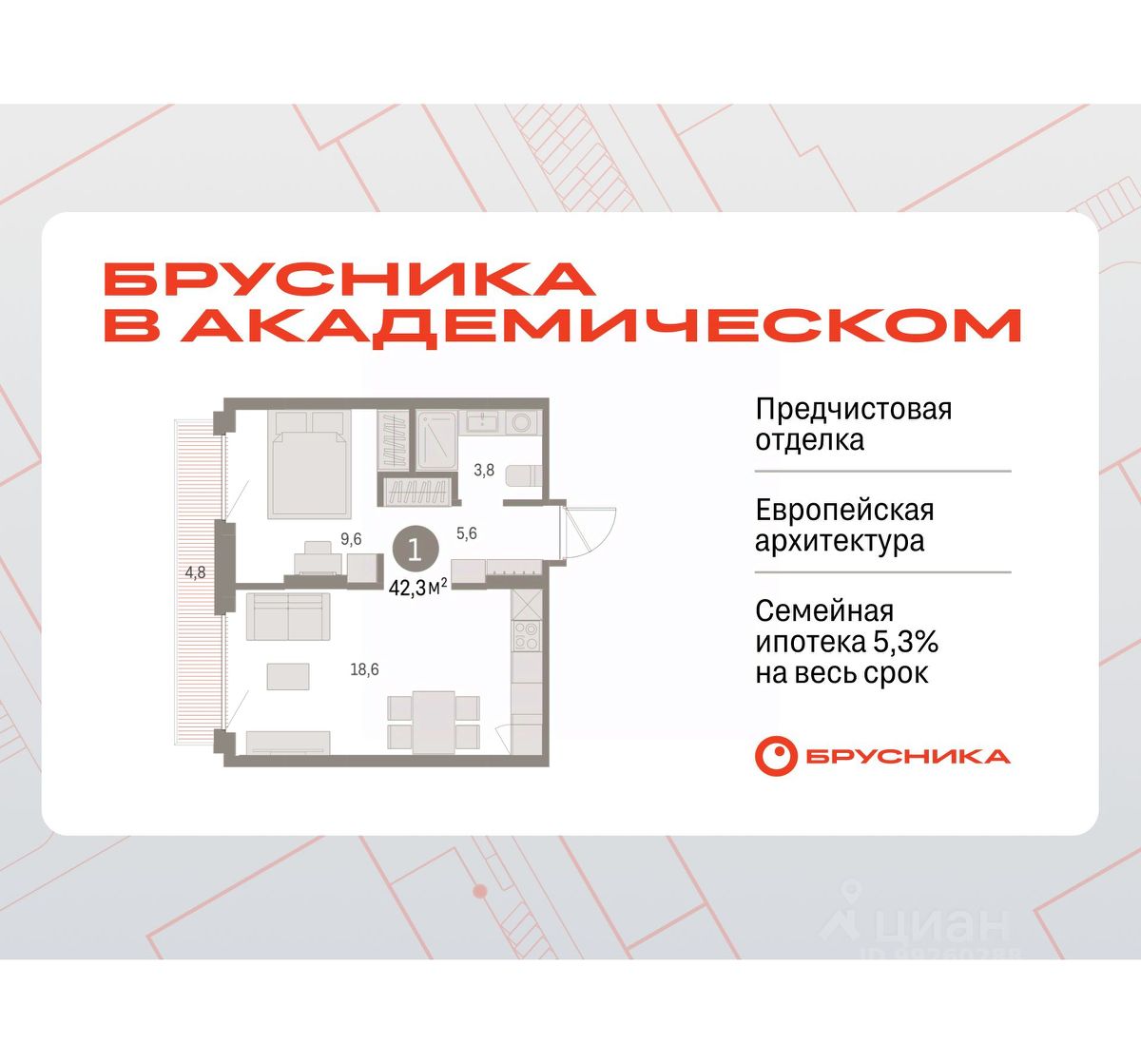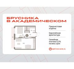 Квартира с кухней-гостиной и одной спальней в Бруснике в Академическом. Особенности планировки: предчистовая отделка, балкон.