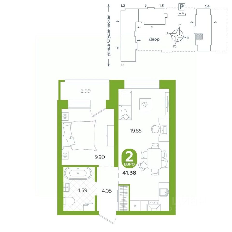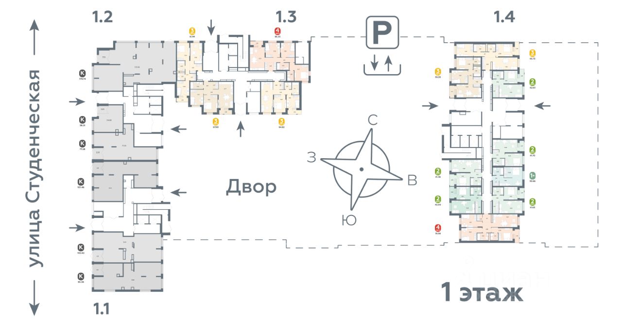 Предусмотрен подземный паркинг и кладовые. Срок сдачи 3 квартал 2026 г.