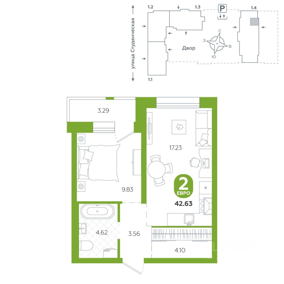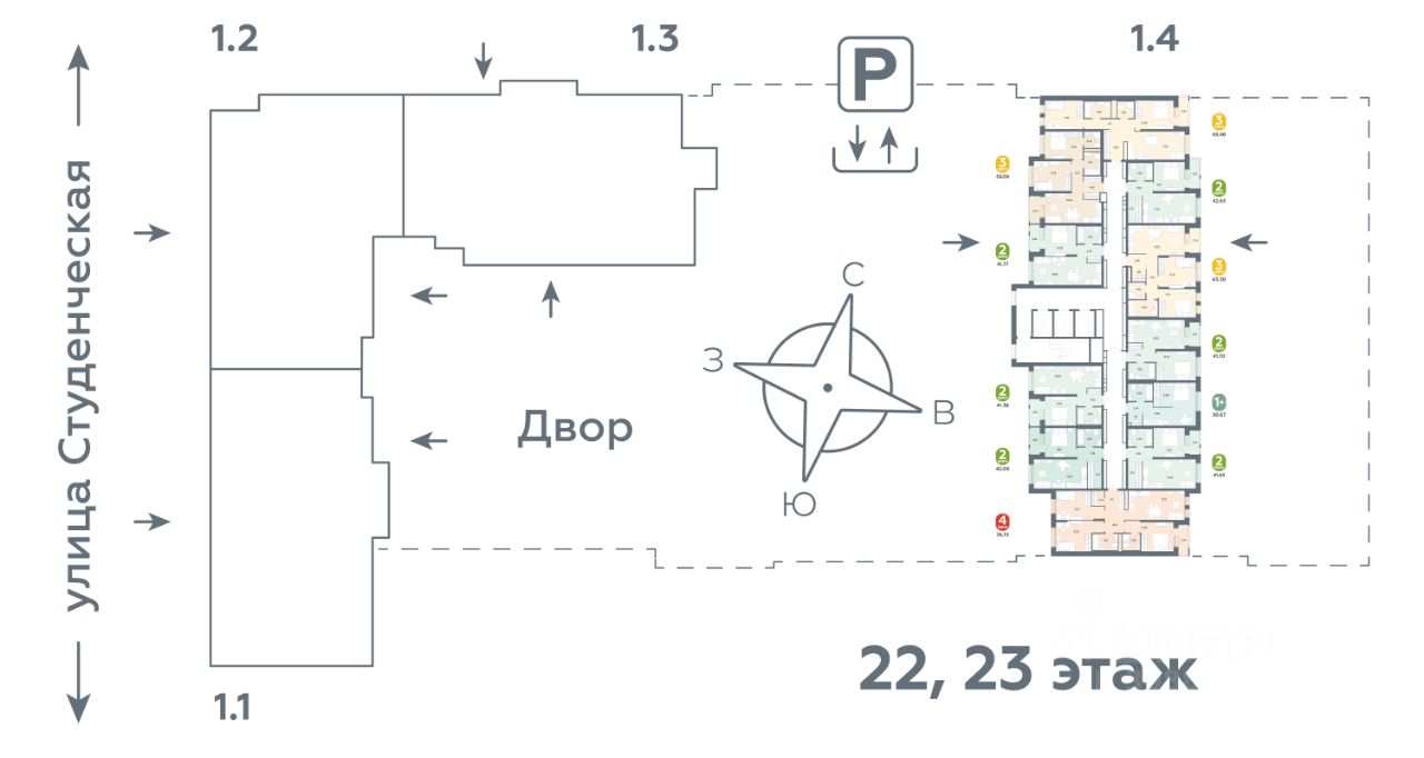 Предусмотрен подземный паркинг и кладовые. Срок сдачи 3 квартал 2026 г.
