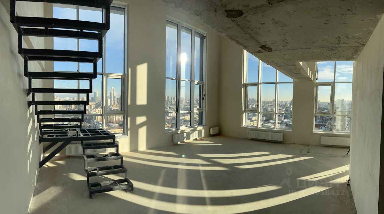 • Двухэтажный пентхаус с просторной гостиной и кухней-столовой, высота потолков — 6 метров, панорамные окна высотой 4.5 метра.