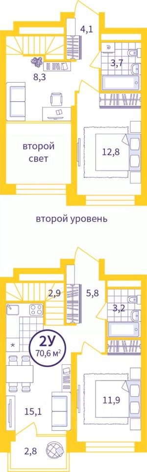 Продается 2-комн. квартира в ЖК "Астон.Сезоны" на 19 этаже. Квартира без отделки, после оформления собственности можно делать ремонт. Общая площадь: 68.59 кв.м., жилая: 24.7 кв.м., площадь просторной кухни-столовой: 15.1 кв.м. Комнаты изолированные, все окна выходят на одну сторону. В квартире один балкон, два совмещенных санузла. Высота потолков 2.7 м.