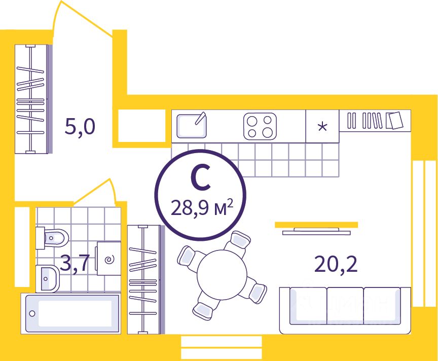 Просторная 1-комн. квартира-студия в ЖК "Астон.Сезоны" на 15 этаже. Квартира без отделки, после выдачи ключей можно делать ремонт. Общая площадь: 28.9 кв.м., площадь гостиной 20 кв.м., из которых 5 кв.м. выделено под кухонную зону. Угловая квартира, очень светлая, естественная вентиляция при открытии окон. В квартире один совмещенный санузел. Высота потолков 2.7 м.