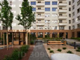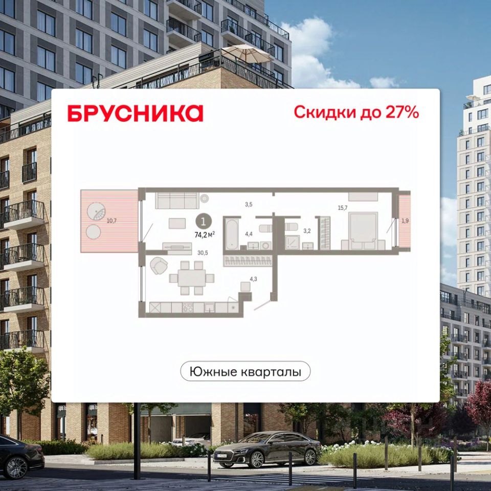 Квартира с кухней-гостиной и одной спальней в Южных кварталах. Особенности планировки: вид во двор, гардеробная, лоджия, мастер-спальня, окна на две стороны, предчистовая отделка, терраса.