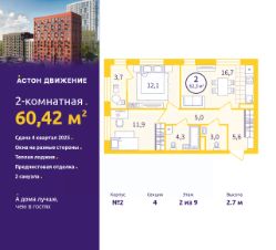 2-комн. квартира с предчистовой отделкой в ЖК "Астон.Движение" на 2 этаже. Общая площадь: 60.42 кв.м., жилая: 24 кв.м., площадь просторной кухни-столовой: 16.7 кв.м. Квартира угловая, идеально подойдет любителям тишины и панорамных видов. В квартире одна лоджия, один совмещенный и один раздельный санузел. Высота потолков 2.7 м.